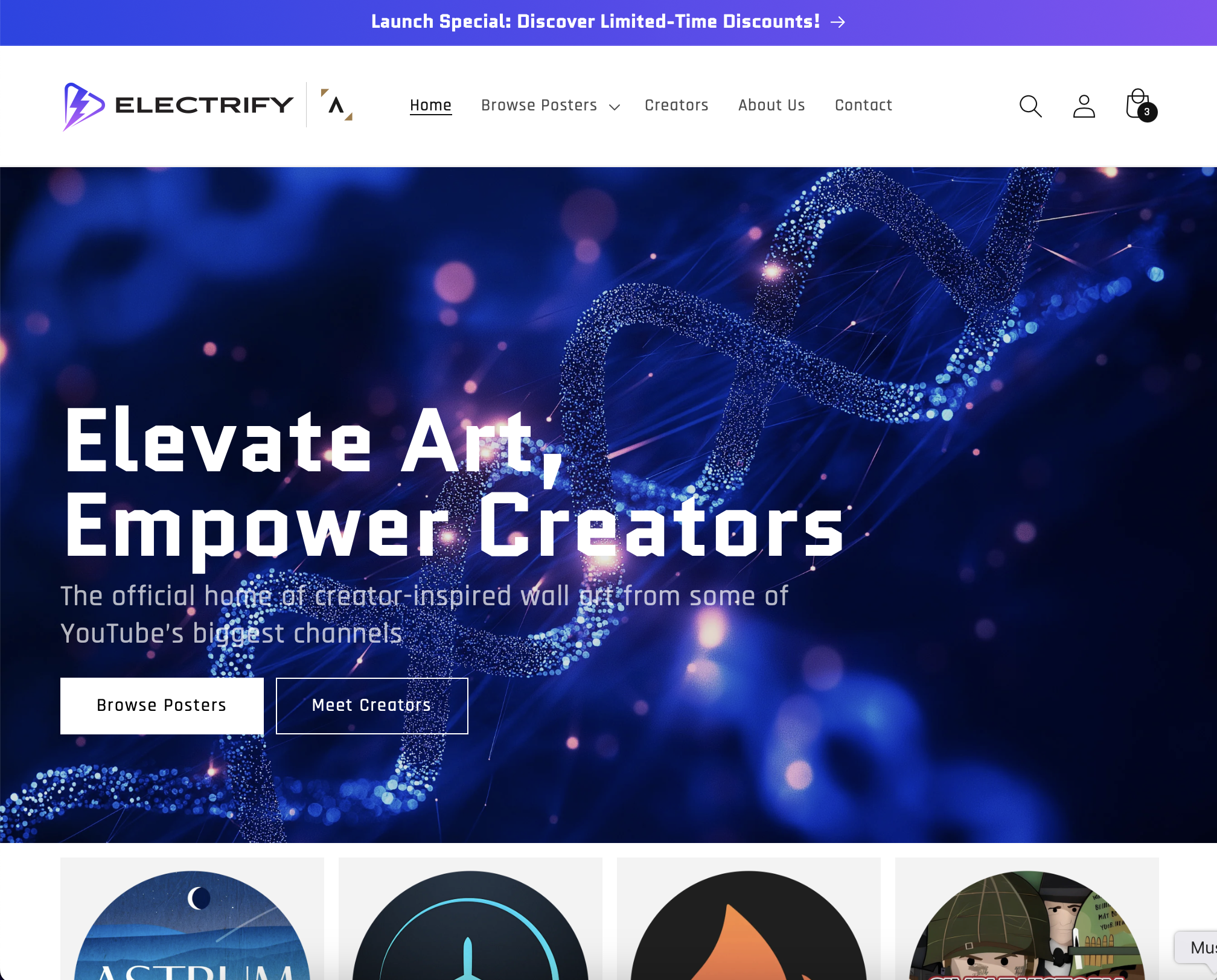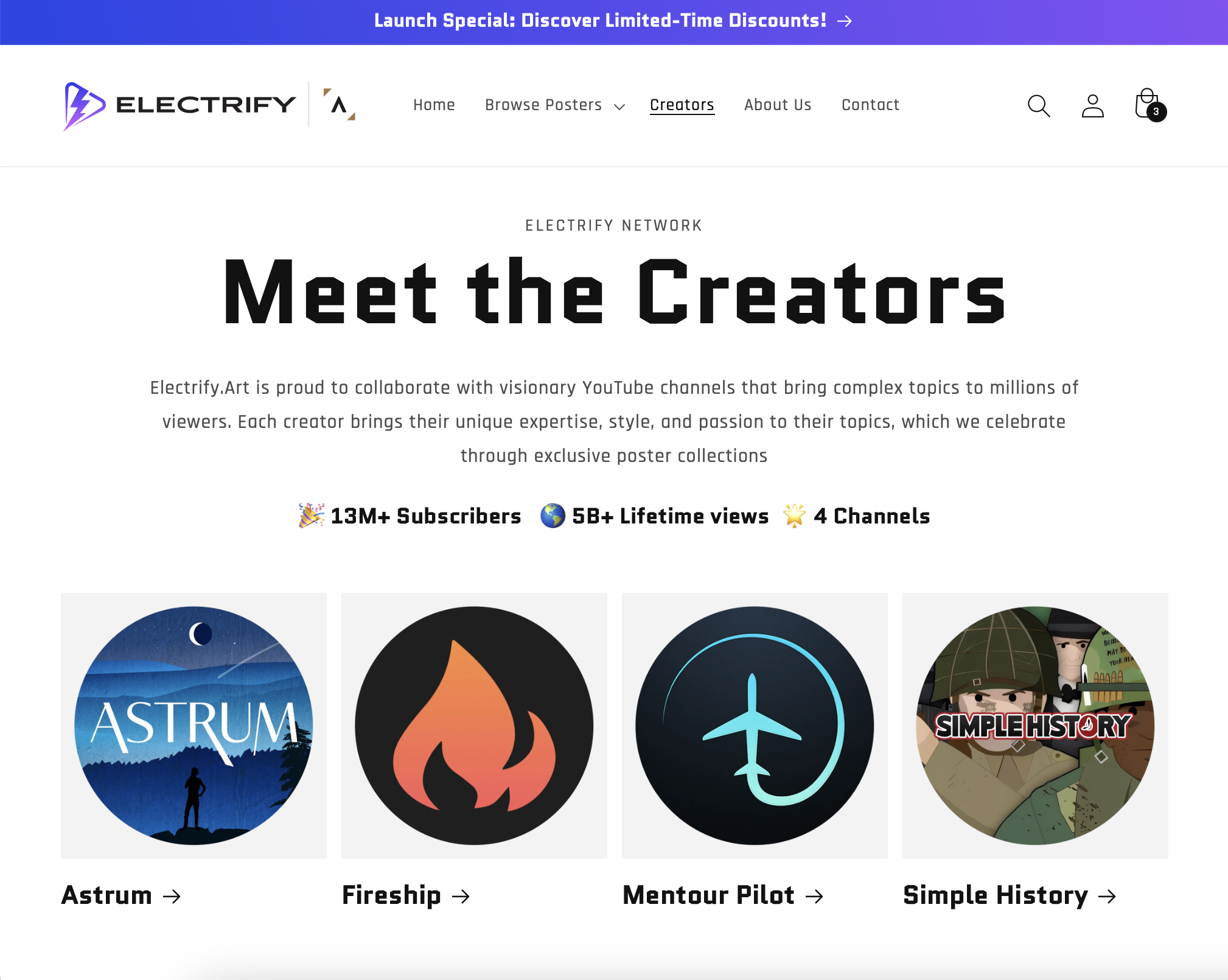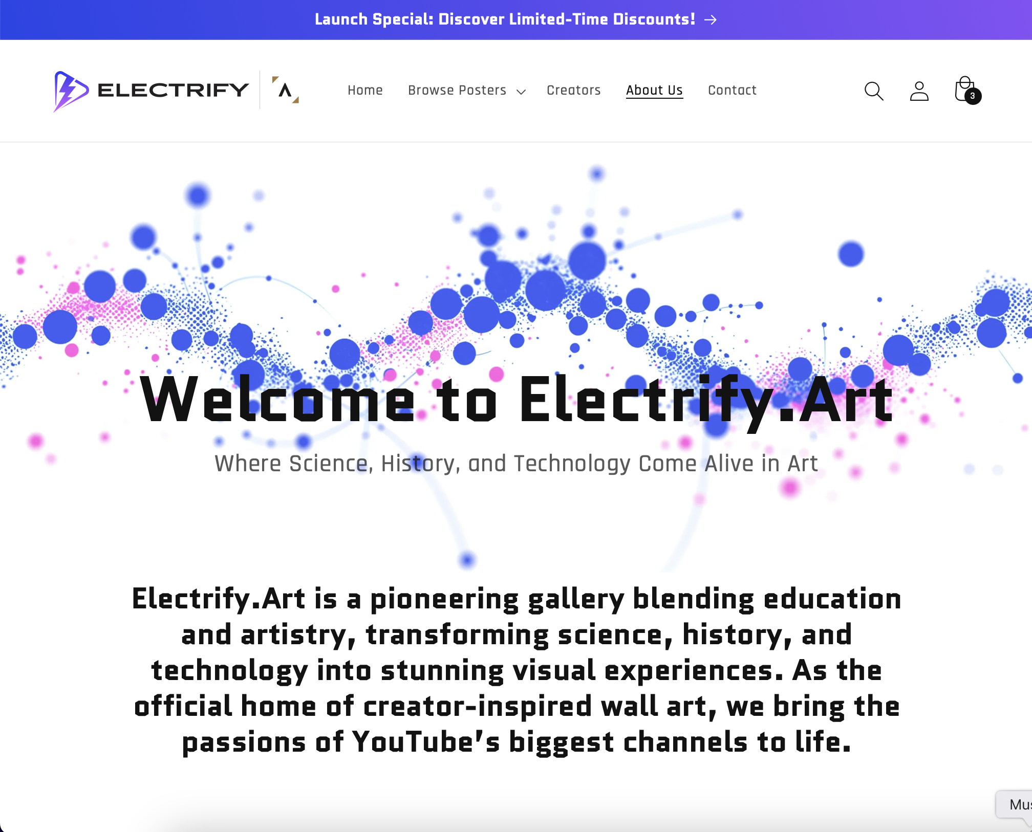 Electrify.Art to pionierska galeria łącząca edukację i sztukę, przekształcająca naukę, historię i technologię w zachwycające wizualne doświadczenia. Electrify.Art jest oficjalnym źródłem plakatów dla wielu największych kanałów YouTube i powstało z wspólnej pasji Electrify Video Partners i Astrography™ Studio: pasji do czynienia wiedzy dostępną, inspirującą i wizualnie zachwycającą. To wyjątkowa współpraca między twórcami treści a projektantami, której celem jest tworzenie sztuki, która jednocześnie informuje i intryguje. Każdy projekt jest starannie zaprojektowany, aby celebrować historie i tematy twórców z YouTube, nadając ich treściom zupełnie nowy wymiar.